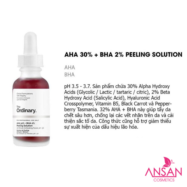 Serum tẩy da chết The Ordinary AHA 30% BHA 2% Peeling Solution với nồng độ acid cao, giúp tẩy lớp tế bào chết bị sừng hóa, giúp làn da tái sinh