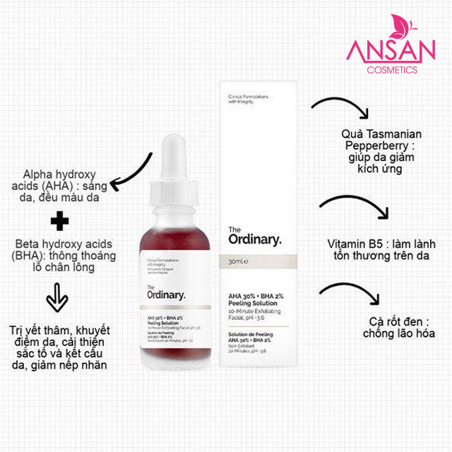 Dạng tẩy tế bào chết hoá học sâu hơn thông thường. Tinh chất The Ordinary giúp loại bỏ lớp tế bào sừng già cỗi bên trên, kích thích lớp tế bào mới bên trong phát triển tốt hơn.