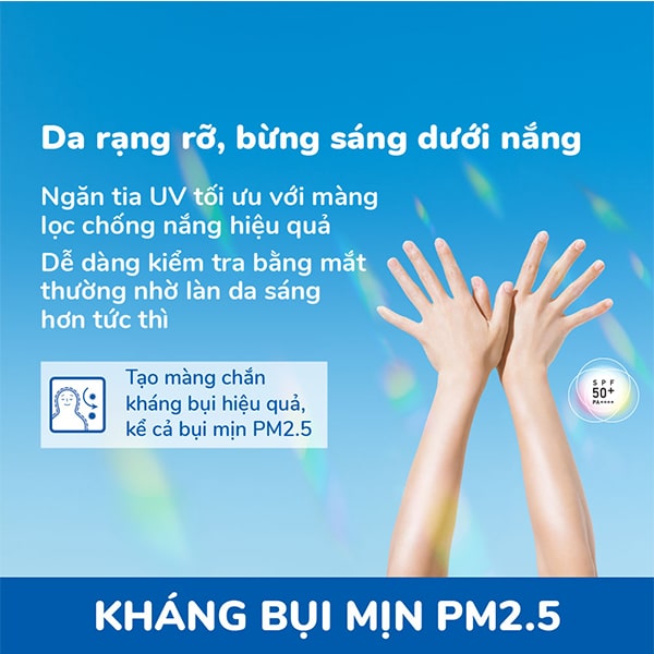 Sản phẩm chống nắng tối ưu, giúp sáng da xỉn màu & kháng bụi hiệu quả kể cả bụi mịn PM 2.5. Tinh chất mang lại làn da rạng rỡ trong veo, bừng sáng lấp lánh mỗi ngày. Bột ngọc trai nghiền mịn giúp phản chiếu ánh sáng, tạo hiệu ứng lấp lánh trên da.