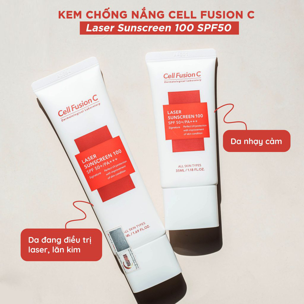 Kem chống nắng Cell Fusion C Laser Sunscreen 100 SPF 50+/PA+++ là kem chống nắng được các bác sĩ Hàn Quốc đánh giá cao tại các bệnh viện da liễu. Cell Fusion C không chỉ an toàn cho mọi loại da mà còn hỗ trợ phục hồi da hoàn hảo sau những lần tiểu phẫu chăm sóc da. Laser là dòng kem chống nắng dành cho da nhạy cảm, da đang điều trị xâm lấn như laser, lăn kim, phi kim hay nặn mụn.