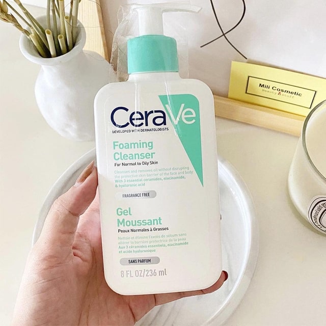 – Sữa rửa mặt CeraVe Foaming Facial Cleanser với các thành phần dưỡng da ceramides, niacinamide, và axit hyaluronic được các bác sĩ da liễu khuyên dùng