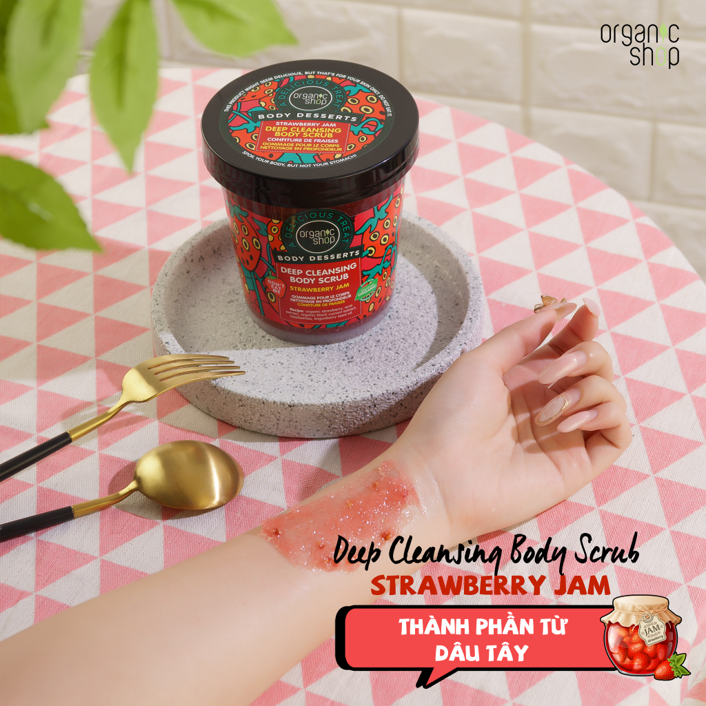 - Strawberry Jam Deep cleansing body scrub :dâu tây hữu cơ, chiết xuất quả acai (siêu quả tốt nhất trong tất cả các loại trái cây), chiết xuất quả lý chua đen, quả mâm xôi và dầu hạt nam việt quất.