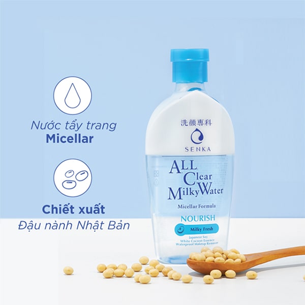 Nước Sữa Tẩy Trang Hai Lớp Senka All Clear Milky Water chứa chiết xuất đậu nành và tơ tằm trắng cùng hàm lượng gấp đôi Hyaluronic Acid không chỉ giúp loại bỏ bụi bẩn, bã nhờn, lớp trang điểm một cách dễ dàng mà còn cấp ẩm, thông thoáng lỗ chân lông, nuôi dưỡng làn da mềm mịn, sáng khỏe.