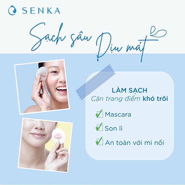 - Công thức mỏng nhẹ độc đáo kết hợp 2 lớp từ nước tẩy trang micellar làm sạch sâu lớp trang điểm đậm cùng Sữa tẩy trang có thanh phần chiết xuất đậu nành Nhật giúp nuôi dưỡng, cấp ẩm cho làn da sạch thoáng, mịn màng, đàn hồi và rạng rỡ.