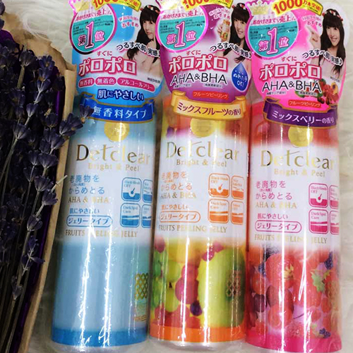 - Fruits Peeling Jelly phát huy tối đa hiệu quả tẩy tế bào chết nhờ khả năng làm sạch sâu trong nang lông và trên cả bề mặt da để làm mềm các tế bào bị sừng hóa, “phân hủy” chất bã nhờn dư thừa, nhờ đó mà đám tế bào chết “ứ đọng” trên da được “thanh trừng”, giảm bớt được tình trạng tắc nghẽn lỗ chân lông sinh mụn, và hơn cả là ngay lập tức, tẩy tế bào chết Detclear Bright & Peel Fruits Peeling Jelly sẽ trả lại cho bạn làn da mướt mát, mềm mịn và sáng tươi như da “em bé”.