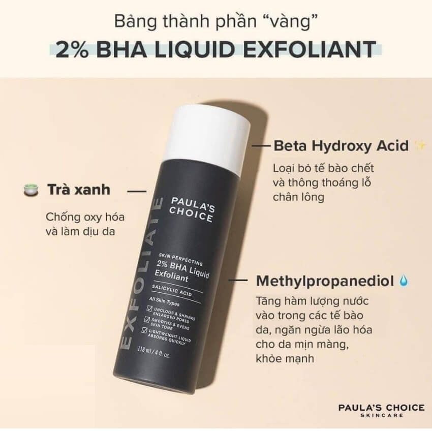 -Paula's Choice Skin Perfecting 2% BHA Liquid Exfoliate chứa thành phần chính là Salicylic Acid (BHA), một acid gốc dầu. Khả năng của BHA có thể tan trong dầu nên dễ dàng tác động vào lỗ chân lông, đẩy nhanh chóng bụi bẩn và bã nhờn lên bề mặt da. Nhờ vậy, tình trạng mụn ẩn, da sần sùi được cải thiện nhanh chóng.