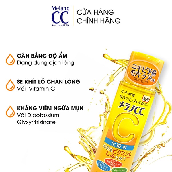 Dung Dịch Dưỡng Sáng Da Melano CC Whitening Lotion là sản phẩm Lotion dưỡng da đến từ thương hiệu Melano CC được nhập khẩu trực tiếp từ Nhật Bản, giúp cân bằng độ ẩm trên da sau bước rửa mặt, hỗ trợ thu nhỏ lỗ chân lông và dưỡng sáng đều màu da với thành phần Vitamin C & Vitamin E, đồng thời kháng viêm và ngăn ngừa mụn hình thành. Công thức dạng dung dịch lỏng, thẩm thấu nhanh vào da, không gây nhờn rít.