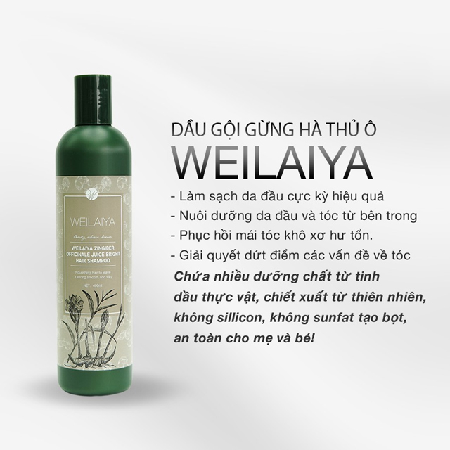 - Dầu gội xả gừng hà thủ ô Weilaiya nuôi dưỡng sợi tóc khỏe, đàn hồi hơn.