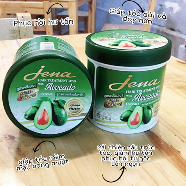 • Ủ tóc tinh dầu bơ Jena với thành phần dưỡng chất chiết xuất từ tinh dầu bơ, giúp phồi tóc nhờ vitamin, khoáng chất, giúp tóc mềm mại, bóng mượt lâu dài. Bên cạnh đó còn có tác dụng cải thiện cấu trúc tóc, giảm hư tổn và phục hồi từ gốc đến ngọn.