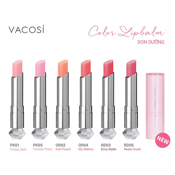 Son dưỡng VACOSI có màu với sắc hồng, cam tự nhiên, độ bóng vừa phải. Chứa công thức giàu chất dưỡng ẩm, bảo vệ môi trong suốt nhiều giờ.