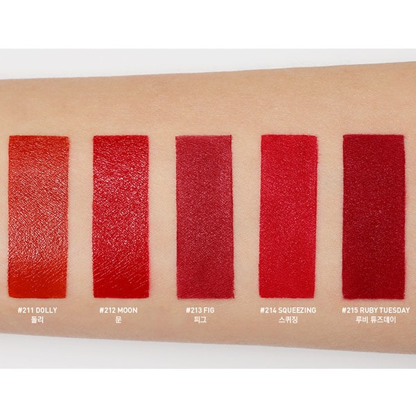 3CE Red Recipe #211 Dolly – đây là màu đỏ cam thiên đỏ phù hợp với nhiều tông da từ ngăm khỏe khoắn đến trắng sáng không tỳ vết. Tuy nhiên hợp nhất vẫn là những bạn gái sở hữu tông da hơi tối, màu đỏ cam thiên đỏ khiến bạn luôn năng động, trẻ trung nhưng lại không mất đi nét quyến rũ vốn có. Thuộc nhóm son satin, #211 là thỏi son có hiệu ứng bóng nhẹ khi lên môi lại vô cùng mịn mượt, không bột gợn, dễ tán hợp với nhiều bạn gái lần đầu làm quen với makeup.