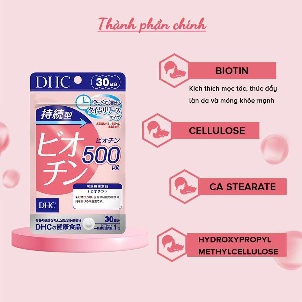 Thành phần trong mỗi viên nén DHC Sustained Release Biotin có chứa: + Biotin: 500μg. + Phụ liệu: Cellulose, bột đường, hydroxymethylcellulose, calci stearate, silicon dioxide microparticles.