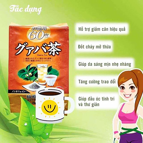 Trà giảm cân Guava Tea với thành phần từ tinh chất lá ổi non thiên nhiên Nhật Bản. Tạo nên một hương vị vô cùng đặc biệt trong mỗi tách trà, giúp bạn cảm thấy sảng khoái và đánh tan những phần mở thừa trên cơ thể. Phụ nữ Nhật đều sử dụng dòng trà này thay cho khẩu phần nước uống mỗi ngày tại nhà.