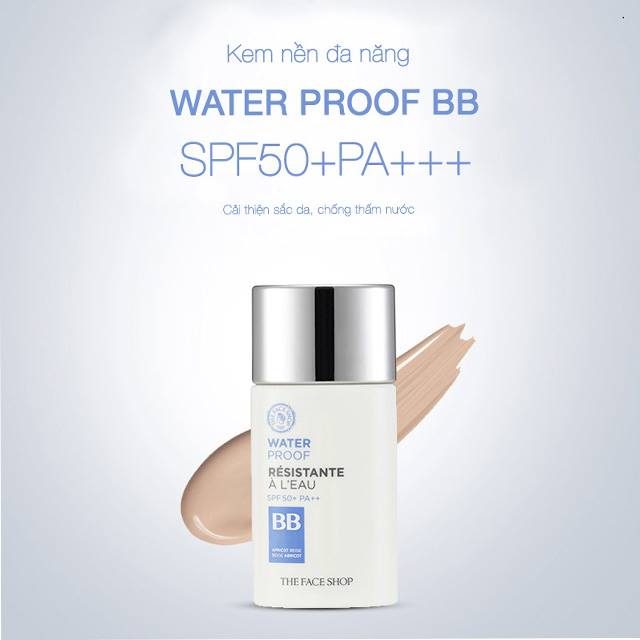 Kem trang điểm của WATERPROOF BB của THEFACESHOP là dòng BB Cream chống thấm nước, vừa có tác dụng trang điểm, vừa có tác dụng chống nắng cao với SPF50/PA+++