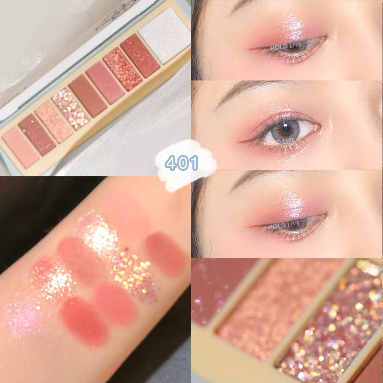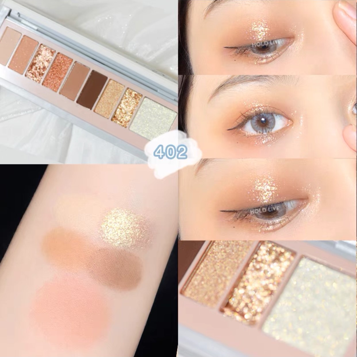 Tông cam đào hồng đất .Bảng mắt mới nhất từ nhà Hold Live, thiết kế cực xinh xắn kèm theo gương tiện lợi, phối hợp 9 ô màu trendy với các chất phấn khác nhau: lì, nhũ, bắt sáng… dễ dàng kết hợp và trải nghiệm nhiều phong cách trang điểm đa dạng.