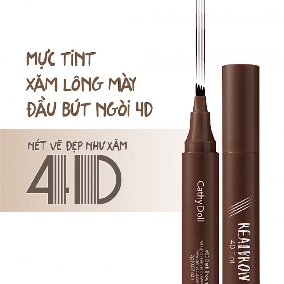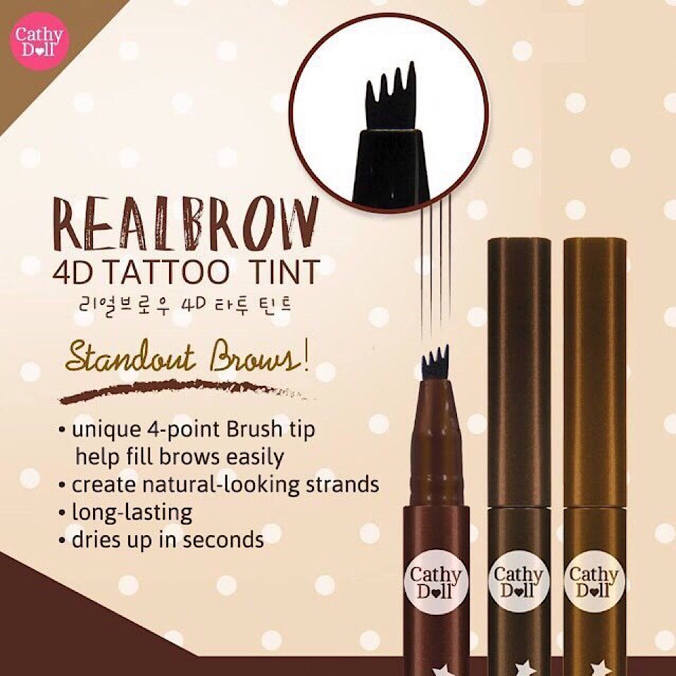 Là bút vẽ lông mày dạng mực Tint với thiết kế đầu bút 4 điểm tạo hiệu ứng lông mày sắc nét đến từng sợi lông mày. Sản phẩm ứng dụng công nghệ đặc biệt mang đến cho bạn hàng chân mày hài hòa, tự nhiên và lưu giữ màu suốt nhiều giờ liền. Đặc biệt hơn nữa, Cathy Doll Real Brow 4D Tint đảm bảo không lem, không trôi khi gặp nước, bạn có thể tha hồ hoạt động ở ngoài trời, bể bơi mà không phải lo sợ bị bay màu.